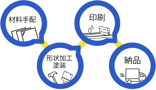 ひとつの製品を作るために、精密板金加工・シルクスクリーン印刷のように多数の加工工程を組み合わせるケースは散見されます。加工ごとにそれぞれの業者への依頼をすることで余分な配送時間や中間コストが必要になり、トータルコストが予想よりも高くなってしまうことも多いです。弊社の一括請負サービスなら、材料手配・形状加工・印刷をまとめて請け負うことが可能で、納期短縮や低コスト化など様々なメリットが生まれます。